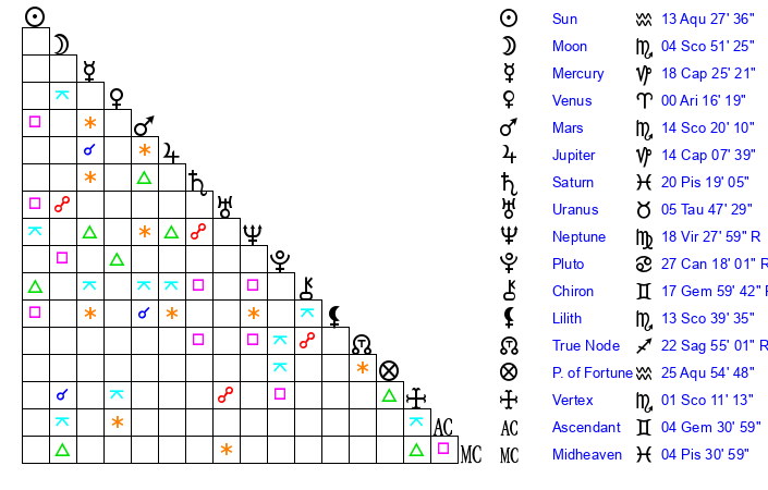 | Sun | 13 Aquarius 27 | 14 Aquarius 6 | 10 Taurus 53 |