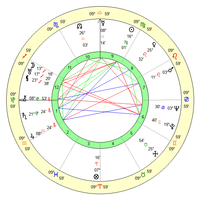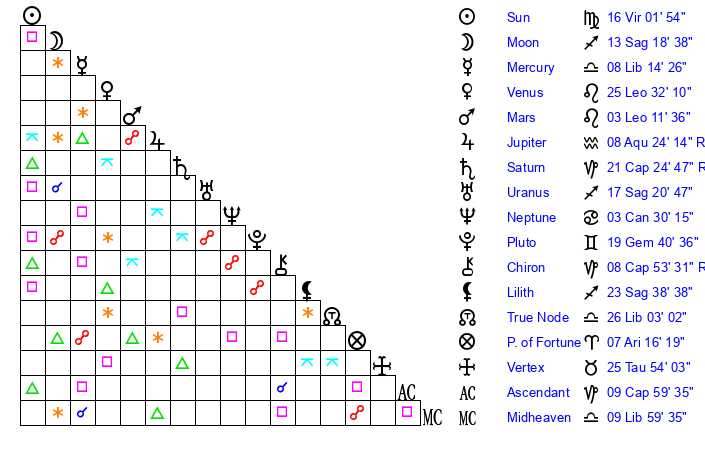 | Sun | 16 Virgo 1 | 17 Virgo 14 | 19 Capricorn 16 |