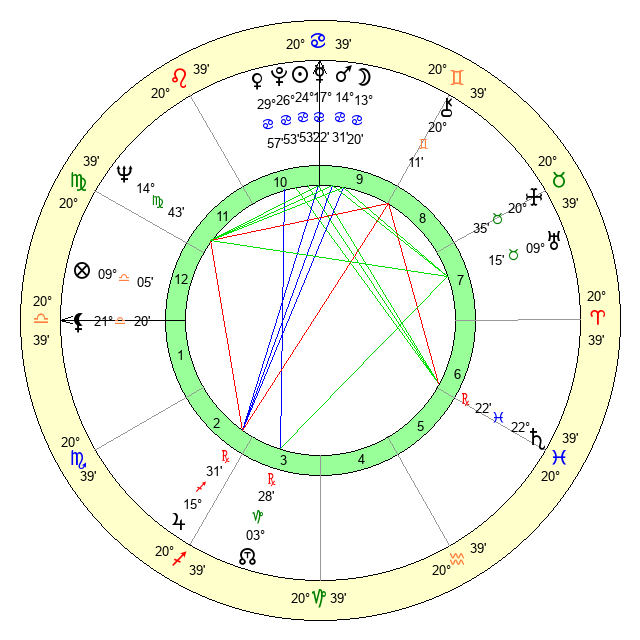 | Moon | 13 Cancer 11 | 21 Aries 6 | 13 Libra 15 |