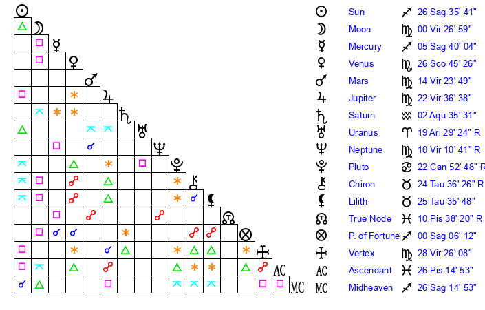 | Sun | 26 Sagittarius 35 | 27 Sagittarius 16 | 29 Pisces 38 |