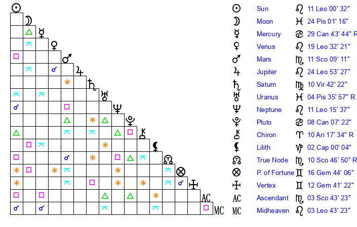 | Sun | 11 Leo 0 | 11 Leo 36 | 24 Scorpio 3 |