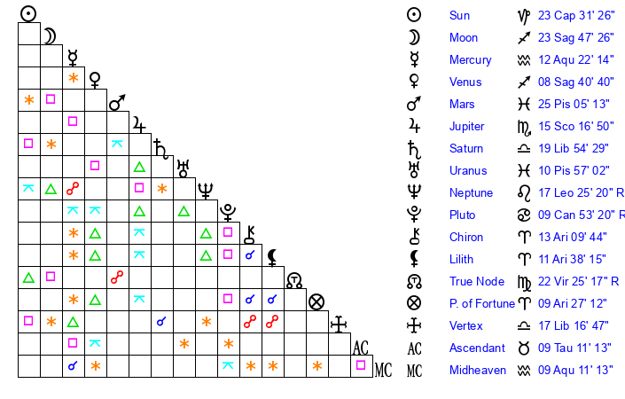 | Neptune | 17 Leo 24 | 27 Pisces 32 | 15 Leo 22 |