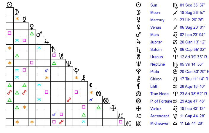 | Sun | 1 Scorpio 33 | 2 Scorpio 32 | 7 Aquarius 49 |
