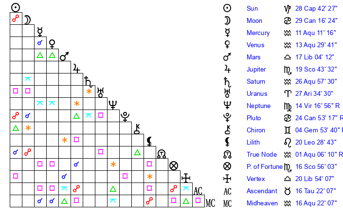 | Uranus | 27 Aries 34 | 23 Taurus 19 | 1 Taurus 16 |
