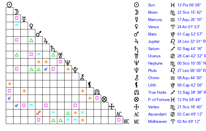 | Sun | 12 Pisces 6 | 12 Pisces 22 | 19 Taurus 59 |