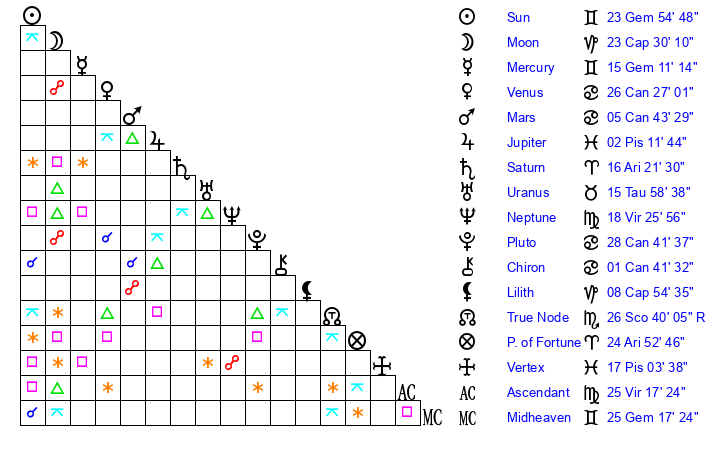 | Sun | 23 Gemini 55 | 24 Gemini 50 | 17 Virgo 18 |