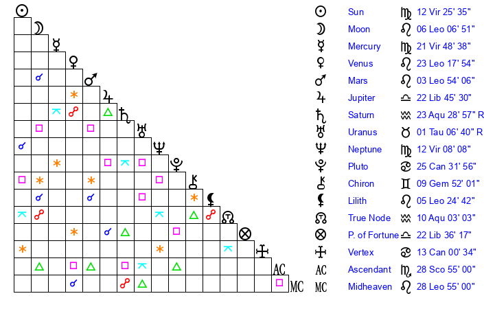 | Moon | 6 Leo 10 | 16 Aquarius 53 | 29 Scorpio 24 |