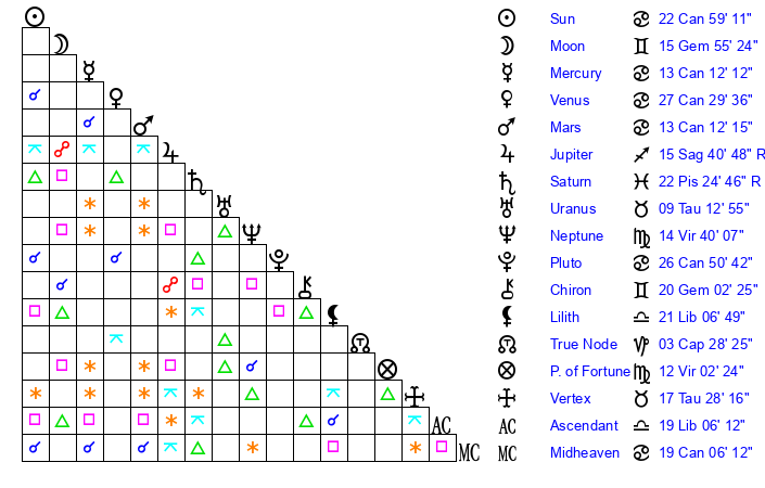 | Sun | 22 Cancer 59 | 23 Cancer 27 | 19 Libra 11 |