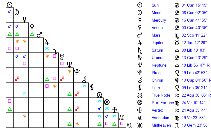 | Sun | 1 Cancer 15 | 1 Cancer 36 | 11 Virgo 11 |