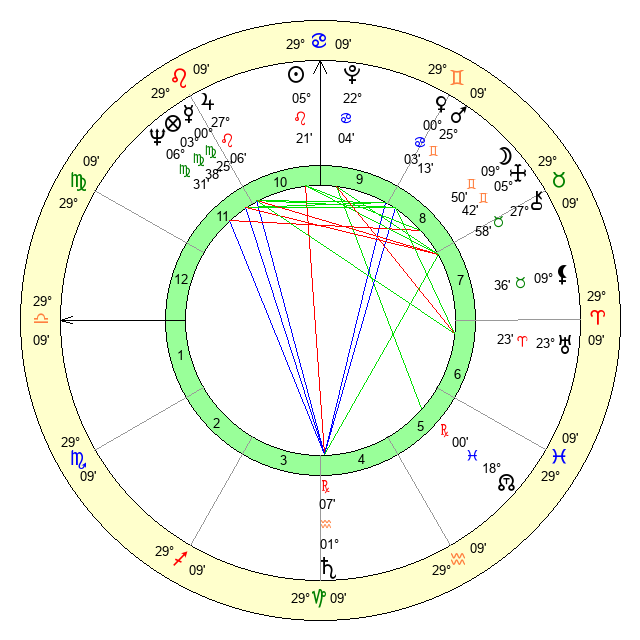 | Moon | 9 Gemini 46 | 23 Virgo 28 | 7 Scorpio 13 |