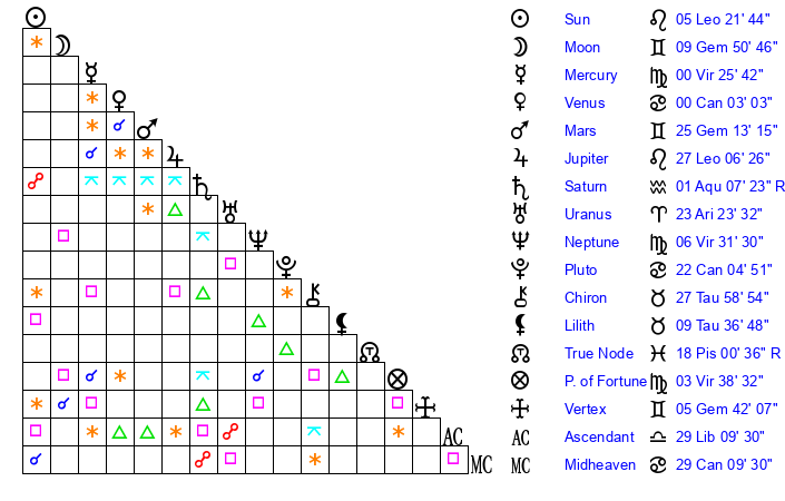 | Jupiter | 26 Leo 54 | 11 Cancer 1 | 16 Virgo 9 |