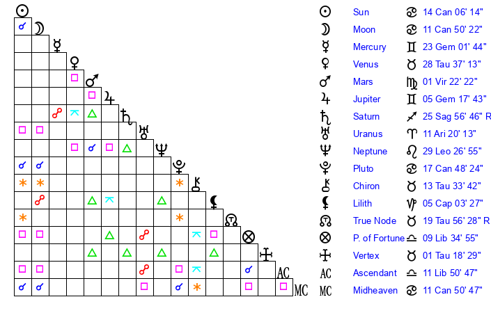 | Sun | 14 Cancer 6 | 14 Cancer 52 | 16 Libra 54 |