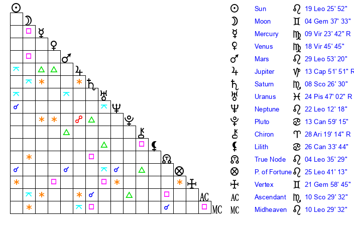 | Neptune | 22 Leo 12 | 1 Aries 46 | 24 Leo 46 |