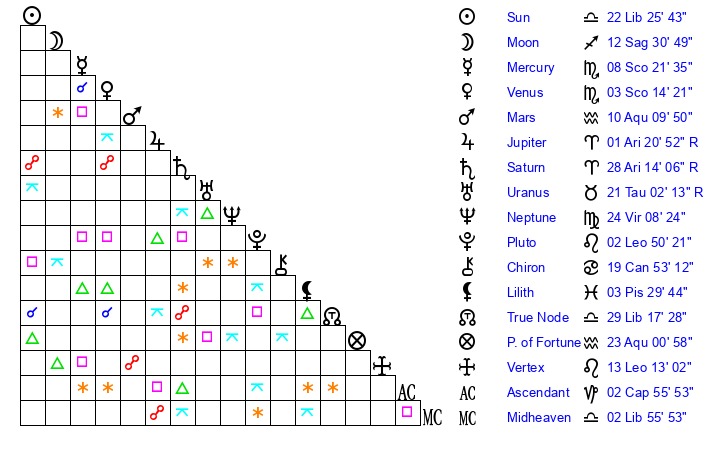 | Sun | 22 Libra 25 | 23 Libra 35 | 19 Capricorn 19 |