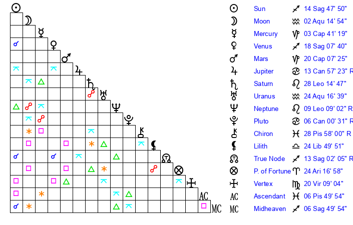 | Moon | 2 Aquarius 16 | 23 Cancer 58 | 1 Capricorn 7 |