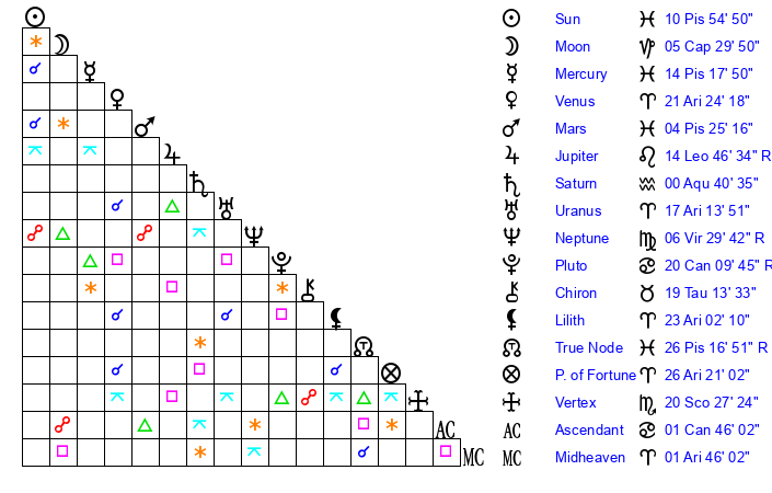 | Moon | 5 Capricorn 29 | 4 Aries 18 | 23 Taurus 12 |