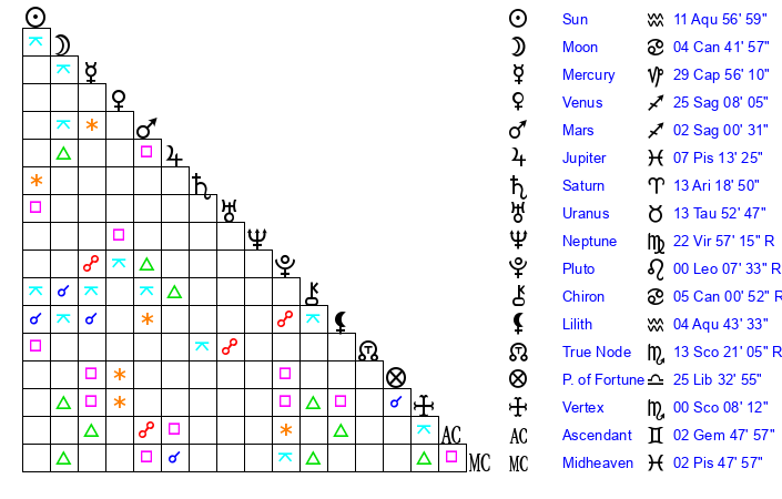| Sun | 11 Aquarius 57 | 13 Aquarius 5 | 7 Taurus 30 |