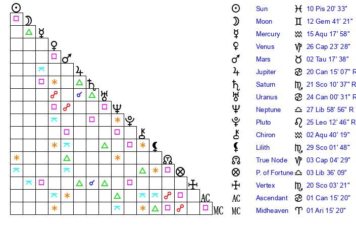 | Sun | 10 Pisces 20 | 11 Pisces 22 | 19 Taurus 15 |