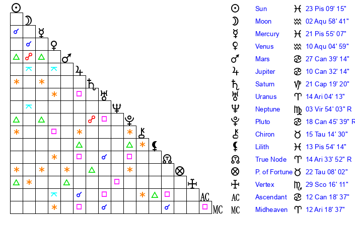 | Moon | 2 Aquarius 54 | 28 Virgo 52 | 1 Cancer 59 |