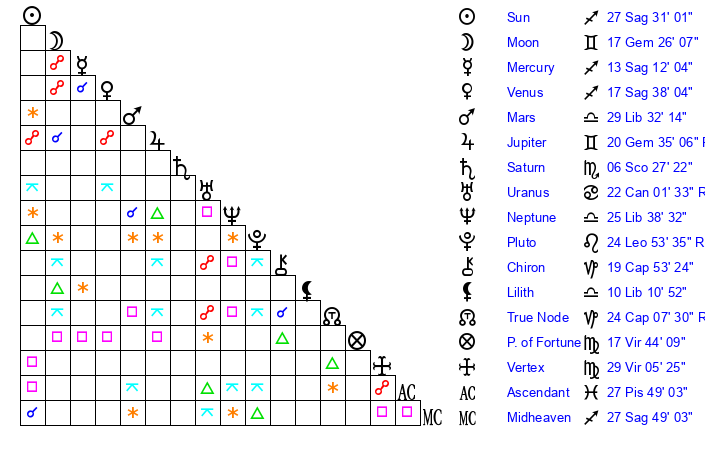| Moon | 17 Gemini 27 | 24 Sagittarius 4 | 24 Capricorn 46 |
