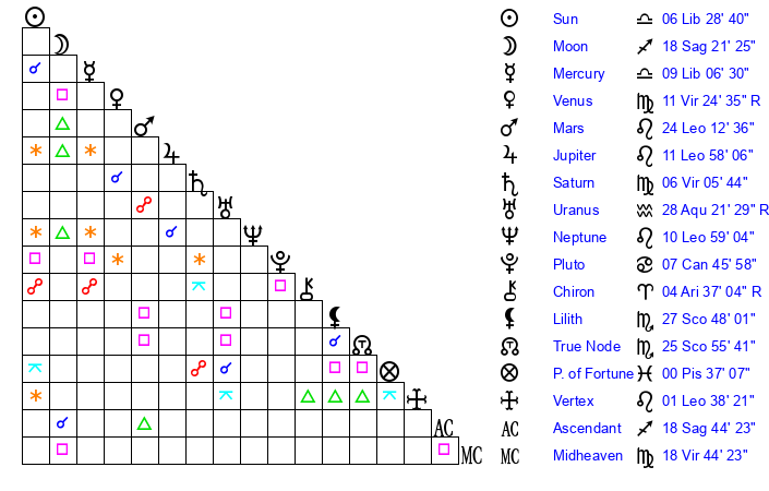 | Saturn | 6 Virgo 44 | 27 Pisces 40 | 11 Virgo 58 |