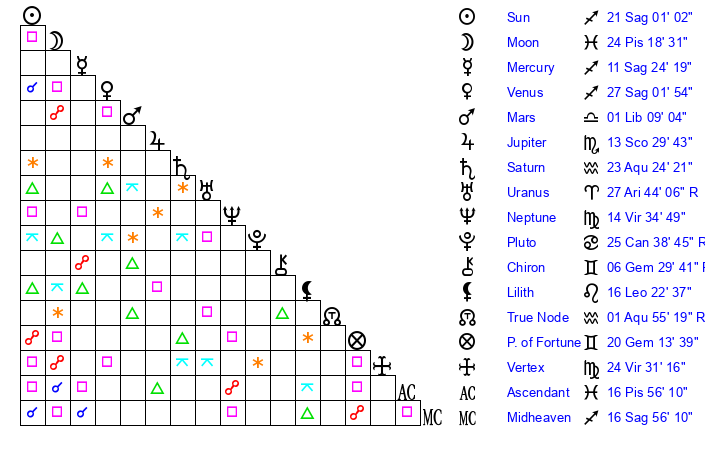 | Sun | 21 Sagittarius 0 | 21 Sagittarius 56 | 23 Pisces 11 |