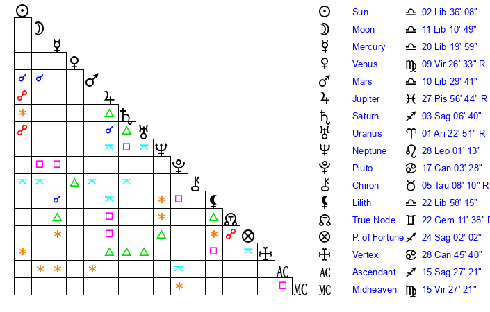 | Moon | 11 Libra 12 | 27 Scorpio 46 | 10 Taurus 45 |