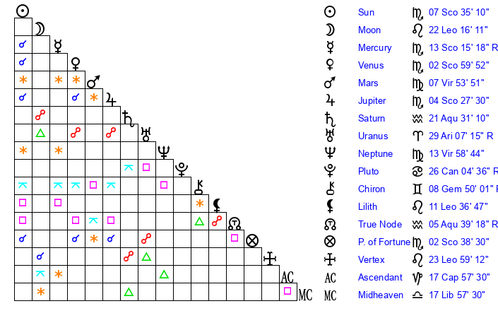 | Sun | 7 Scorpio 35 | 8 Scorpio 31 | 9 Aquarius 53 |