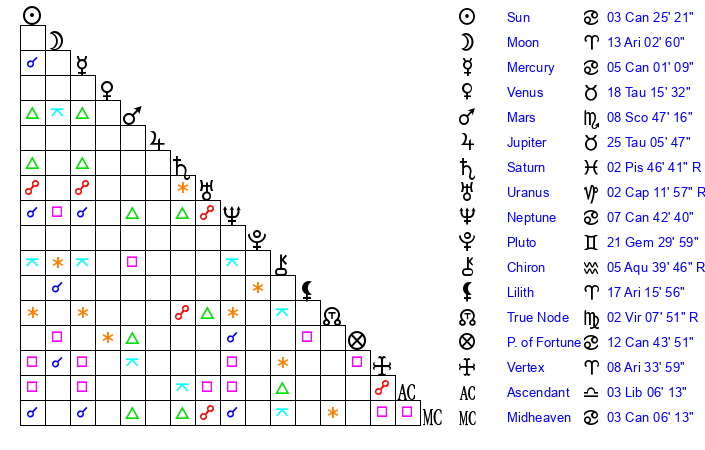 | Moon | 12 Aries 59 | 8 Cancer 1 | 26 Leo 30 |