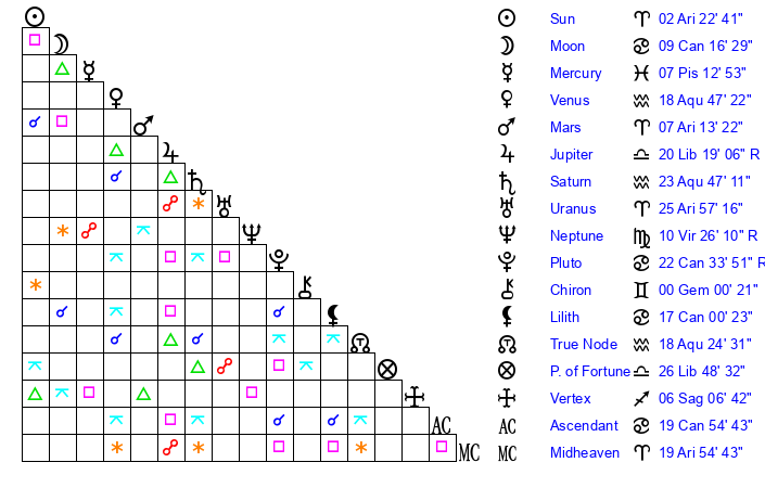 | Pluto | 22 Cancer 33 | 3 Aquarius 24 | 23 Cancer 38 |