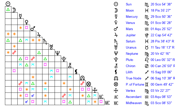 | Sun | 20 Scorpio 54 | 21 Scorpio 34 | 20 Aquarius 18 |