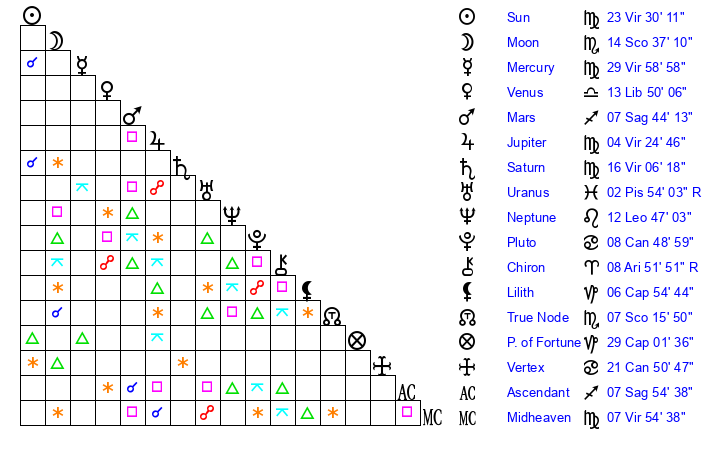 | Moon | 14 Scorpio 42 | 22 Cancer 59 | 20 Virgo 7 |