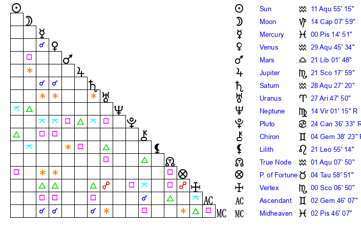 | Venus | 29 Aquarius 46 | 28 Pisces 0 | 19 Gemini 20 |