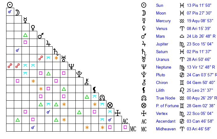 | Sun | 13 Pisces 12 | 14 Pisces 22 | 11 Gemini 13 |