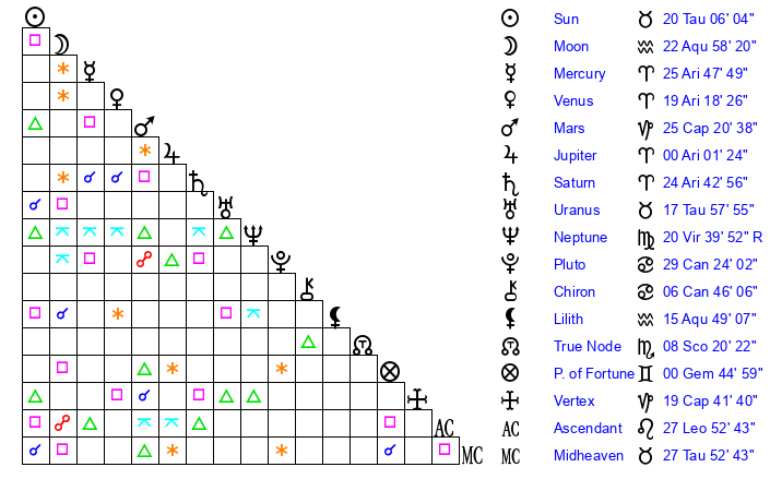 | Neptune | 20 Virgo 39 | 1 Aries 24 | 21 Virgo 36 |