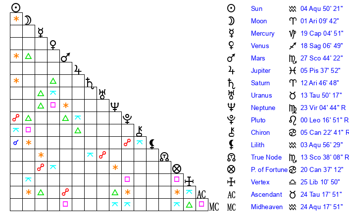| Sun | 4 Aquarius 50 | 5 Aquarius 59 | 0 Taurus 41 |