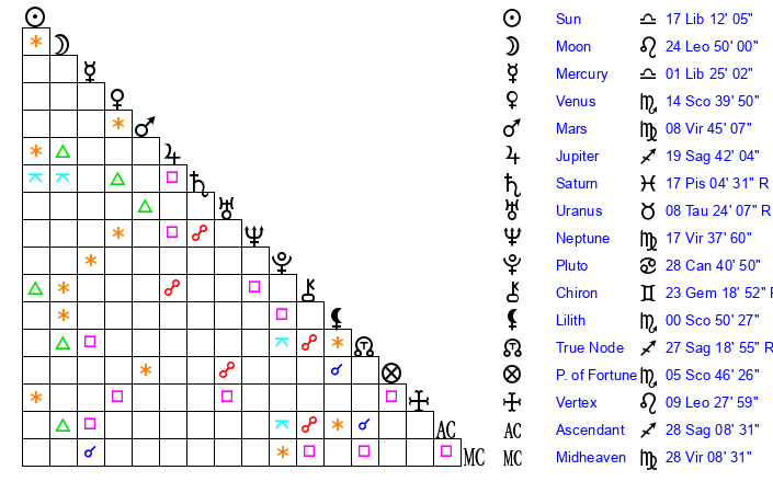 | Neptune | 17 Virgo 37 | 0 Aries 16 | 18 Virgo 52 |