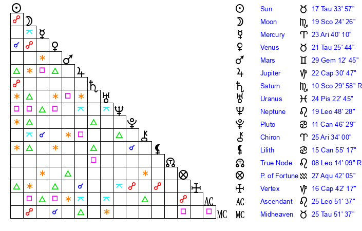 | Sun | 17 Taurus 34 | 18 Taurus 21 | 23 Leo 17 |