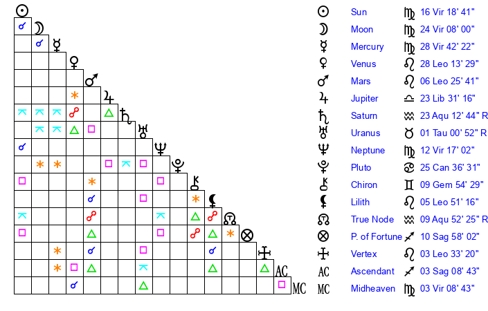 | Moon | 24 Virgo 16 | 13 Aries 24 | 27 Capricorn 0 |