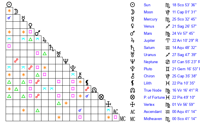 | Sun | 18 Scorpio 54 | 19 Scorpio 33 | 21 Pisces 28 |