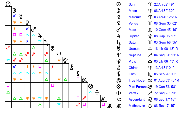 | Sun | 22 Aries 52 | 23 Aries 2 | 14 Gemini 8 |