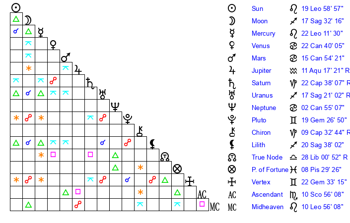 | Sun | 19 Leo 58 | 21 Leo 12 | 21 Sagittarius 47 |
