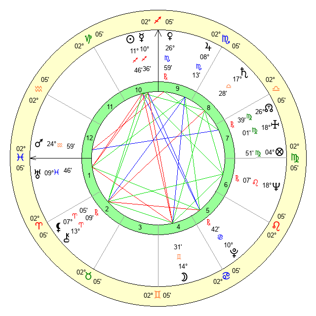 | Moon | 14 Gemini 34 | 9 Gemini 5 | 27 Pisces 51 |