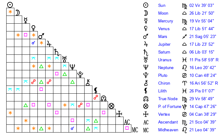 | Neptune | 16 Leo 20 | 1 Aries 28 | 18 Leo 5 |