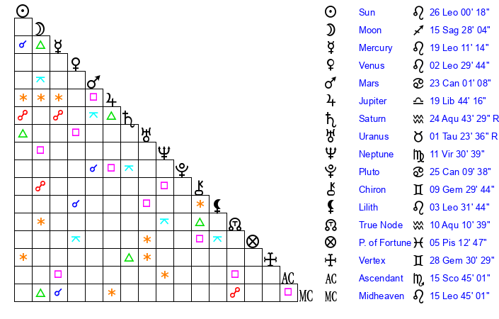 | Sun | 26 Leo 0 | 26 Leo 58 | 25 Scorpio 40 |