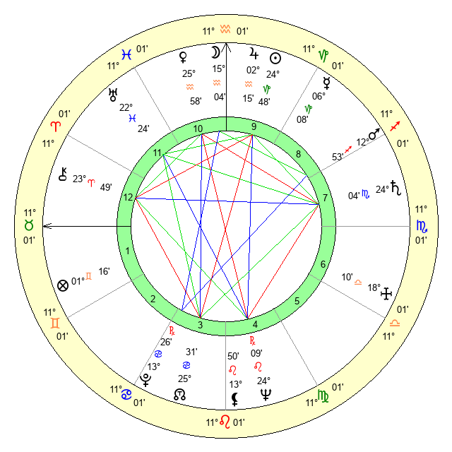 | Moon | 14 Aquarius 57 | 17 Leo 19 | 25 Virgo 25 |