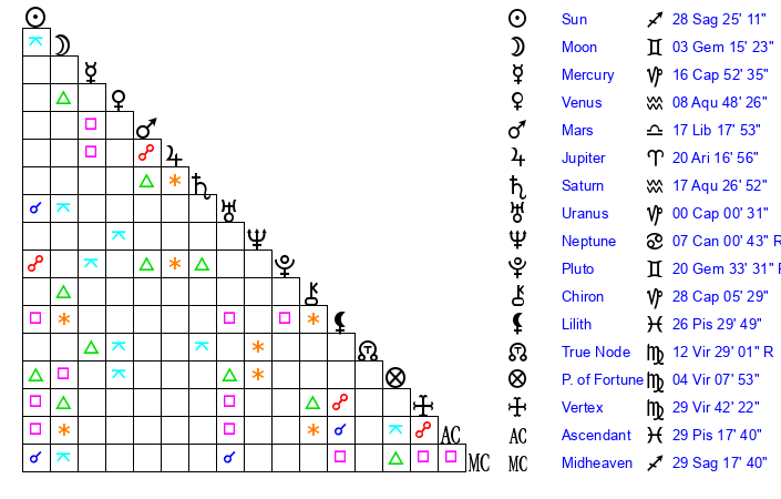 | Pluto | 20 Gemini 34 | 2 Aquarius 23 | 20 Gemini 6 |