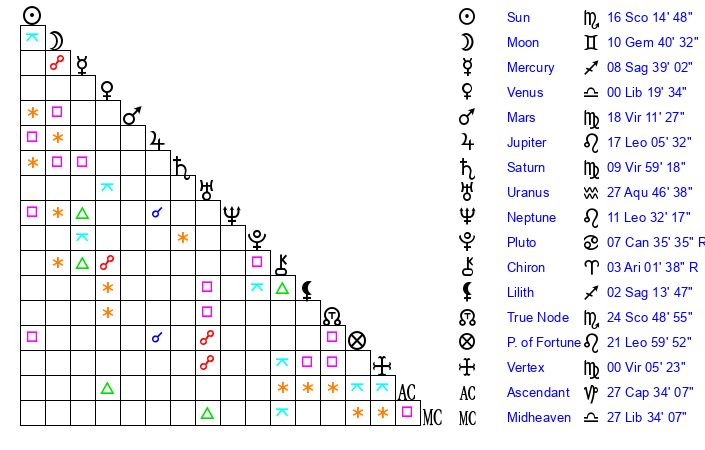 | Sun | 16 Scorpio 14 | 17 Scorpio 33 | 3 Pisces 47 |