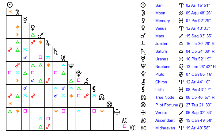 | Venus | 12 Aries 43 | 2 Aries 15 | 17 Leo 47 |