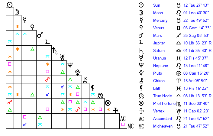 | Sun | 12 Taurus 28 | 13 Taurus 30 | 21 Leo 6 |